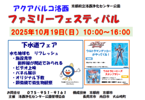 新着記事 2025.10.02 ファミリーフェスティバル開催します。 2025.07.28 Good Summer Night Theater 駐車料 2025.07.07 熱中症警戒アラートの対応 2025.06.30 Good Summer Night Theater 開催決定! 2025.05.21 今朝の来訪者 カテゴリ お知らせ アーカイブ 2025年10月 2025年7月 2025年6月 2025年5月 2025年3月 ファミリーフェスティバル開催します。 2025.10.02 お知らせ 10月19日日曜日 ウルトラマンデッカーがやってきます。 一緒に遊びましょう! 20251019familyfes 洛西浄化センターでは、下水道フェアが開催です。rakusaichirasi